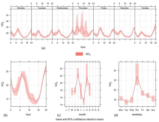 Figure 5 illustrates the variation in nitrogen dioxide (NO2) concentrations in Kenitra, Morocco, across different timescales. The monthly average concentration of NO2 peaked in May at 22.7 ± 3.7 µg/m3 and in August, with a concentration of 21.9 ± 8.2 µg/m3, while it reached the lowest level in July at 14.7 ± 2.7 µg/m3. These peaks are probably influenced by traffic fluctuations, particularly during summer vacation periods, when emissions increase at the beginning and end of vacations []. The hourly distribution of NO2 shows two pronounced peaks, one at 7 a.m. and the other at 11 p.m., suggesting that emissions are closely linked to road traffic [,]. Located near an industrial zone that is known for its continuous activities, the city of Kenitra is significantly impacted by the 3 × 8 work system, where three shifts alternate every 8 h to cover a full day. However, this system causes considerable traffic congestion, as shift change times, typically set at 7 a.m., 3 p.m., and 11 p.m., often coincide with peak hours, leading to increased congestion and overcrowding on the main roads during these periods []. As depicted in Figure 5, daily mean NO2 concentrations exhibited a consistent pattern throughout the week, with relatively stable levels from Monday to Friday, except for a peak on Thursday. A statistically significant reduction in mean concentrations was observed during the weekend. This decrease can be primarily attributed to reduced vehicular traffic compared to weekdays. These findings align with a recent study conducted in Morocco by Oujidi et al. [], which highlighted a pronounced variation in NO2 concentrations between weekdays and weekends. Significantly higher NO2 levels were reported on weekdays, underscoring the substantial impact of road traffic-related activities on air quality. Additionally, special peaks in NO2 concentrations were recorded on Thursday, reaching 30 ± 18.4 h µg/m3 between 5 a.m. and 10 a.m., although other days displayed two peaks: morning and late night. This particularity could be attributed to increased road traffic on that day, linked to the weekly local market, a dynamic place where locals gather to trade a variety of products. These observations highlight the significant impact of local activities, particularly emissions related to traffic, on the variations in NO2 levels throughout the week [].