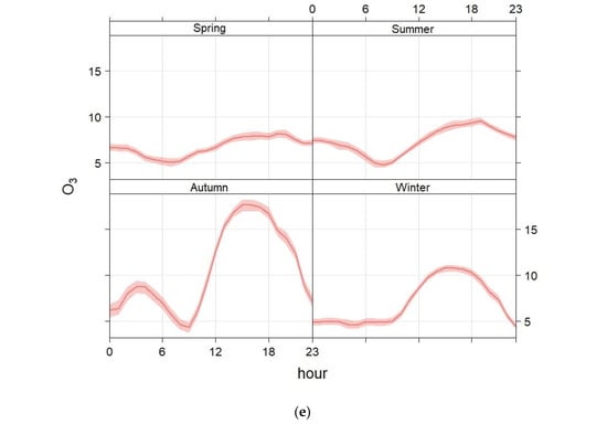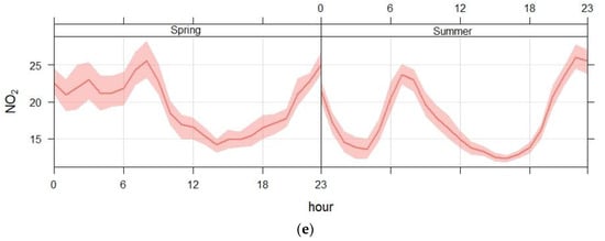 On the other hand, the hourly variation in NO2 concentrations in both spring and summer is shown in Figure 5e. In summer, NO2 concentrations significantly drop between 11 a.m. and 4 p.m. due to intense photolysis facilitated by strong sunlight, with the most significant decrease occurring around noon (12 p.m.–1 p.m.). However, marked peaks are observed during morning rush hours (from 6 a.m. to 9 a.m.) and evening rush hours (from 7 p.m. to 10 p.m.), driven by road traffic and nocturnal pollutant accumulation []. Moderate winds and atmospheric instability enhance pollutant dispersion during the day. However, in spring, NO2 levels are slightly higher than in summer, with moderate photolysis reducing concentrations between 10 a.m. and 4 p.m. compared to the peaks during morning (from 6 a.m. to 9 a.m.) and evening (from 6 p.m. to 11 p.m.). Overall, NO2 peaks in colder months due to limited photolysis and temperature inversions, while summer shows reduced daytime concentrations due to strong photolytic activity. Morning and evening traffic-related peaks are consistent across both seasons.
