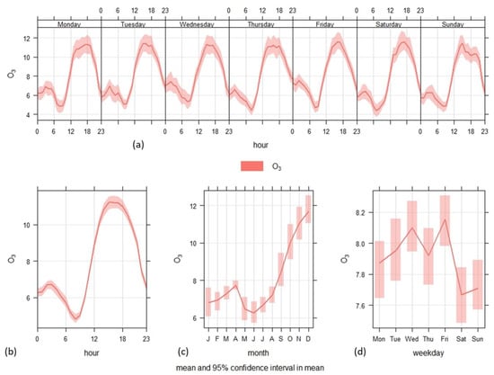 The hourly variation in O3 concentrations closely follows the day–night cycle, with maximum values observed between 9 a.m. and 5 p.m., followed by a significant drop during the night. This pattern is consistent with the photochemical nature of ozone formation, which intensifies during periods of high sunlight and elevated temperatures. Specifically, when solar radiation increases significantly, the photolysis of nitrogen dioxide initiates, leading to a decrease in its concentration (as evident in Figure 5) and subsequently facilitating the formation of O3 []. Daily mean O3 concentrations remained relatively stable from Monday to Friday around a relatively stable average of 8.1 ± 4.8 µg/m3, followed by a statistically significant decrease on weekends. In Kenitra, this weekend effect is attributed to slight reductions in NO2 emissions from vehicular and anthropogenic activities, which act as ozone precursors in urban areas. Sicard et al. [] reported that a substantial decline in nitrogen oxide emissions can lead to an increase in the VOC-to-NOx ratio, favoring O3 formation. However, they found an inverse relationship: a significant decrease in the mean daily O3 concentration was associated with a significant decrease in the VOC-to-NOx ratio. This suggests a complex interplay of factors influencing O3 formation and destruction in our specific urban environment. This stability in ozone concentrations contrasts with the more variable pattern of NO2 levels, highlighting ozone’s dependence on weather conditions rather than direct emissions []. In summary, O3 levels follow a typical diurnal pattern dictated by sunlight and temperature, with maximum concentrations in the afternoon and minimal variations across weekdays. These results underscore the complex interaction between pollutants and weather conditions, with NO2 serving both as a directly emitted pollutant and as a precursor to ozone formation, a relationship confirmed by the observed inverse correlation between the two pollutants [].