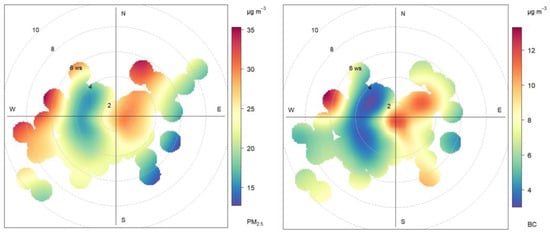 Polar plot of mean levels of PM2.5 (left panel) and BC (right panel) concentrations (in μg/m3) by wind direction and speed.
