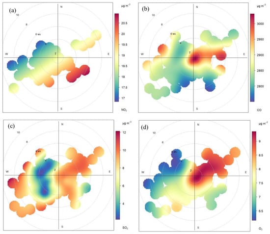 Polar plot of mean concentrations (in μg/m3) of nitrogen dioxide (a), carbon monoxide (b), sulfur dioxide (c), and ozone (d) by wind direction and speed.