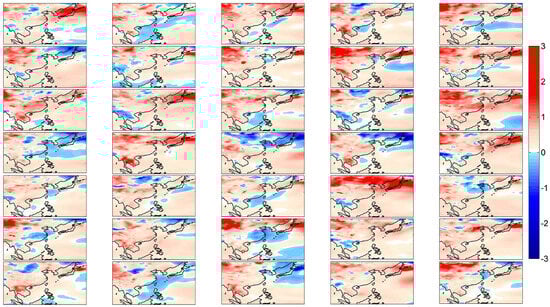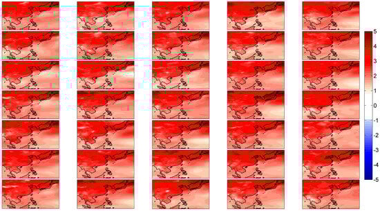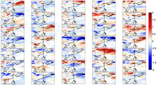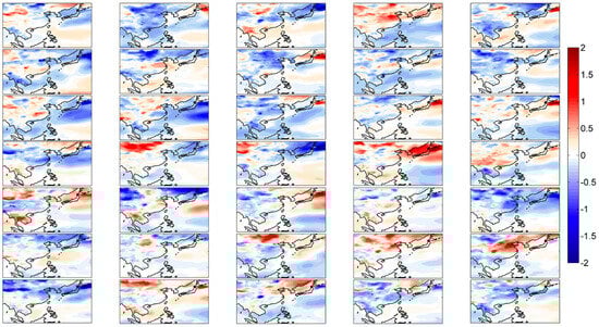 In Figure 1 and Figure 2, we present the total trends in summer (JJA) mean surface air temperature (SAT) for the historical (1966–2005) and RCP8.5 (2010–2060) simulations, respectively. The subplots in Figure 1 and Figure 2 represent the linear trends/40 years and trends/51 years for each of the 35 members of CESM1 during the historical and RCP8.5 scenarios, respectively. Irrespective of the fact that the individual member ensembles are forced with identical radiative forcing, Figure 1 displays a wide range of diversity in its characteristics among the 35 member simulations. In East Asia, the northeastern part displays an amplified cooling trend (≤−2 °C) for the ensemble members (EM) 6, 16, 18, 19 and 33, while some members exhibit a mild cooling trend (≤−1 °C) but across the land–ocean boundary between the eastern part of China and the South China Sea (EM 2, 5, 16, 23, 28 and 32). The signature of warming (≥2 °C) in the landmass poleward of Northern China is evident in many of the runs, e.g., EM 3, 5, 9, 10, 15, 17, 20, 24 and 28. However, not all members exhibit this poleward amplification; instead, the magnitude of warming displays an east–west contrasting pattern in EM 6, 8, 14, 16, 19, 23, 22, 26, 27, 33 and 35.