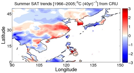 Summer SAT trends [1966–2005; °C (40 yr)−1] over East Asia derived from the CRU-based observation data.