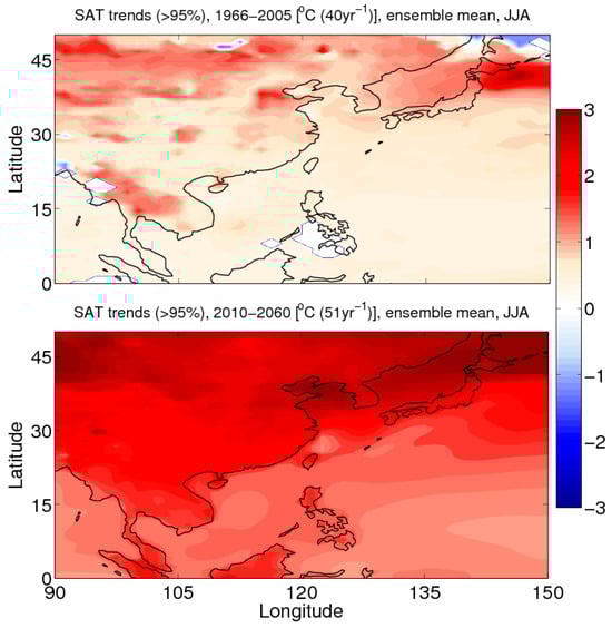 Ensemble mean SAT trends over East Asia for the historical [1966–2005; °C (40 yr)−1] (top panel) and RCP8.5 [2010–2060; °C (51 yr)−1] (bottom panel) scenarios.