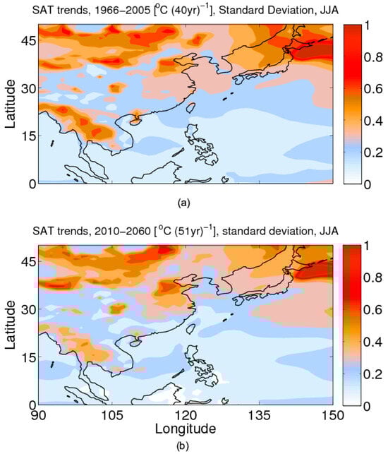 Standard deviation of the SAT trends over East Asia for the historical period (a) and standard deviation of the SAT trends over East Asia under the RCP8.5 scenario (b). The higher the standard deviation, the higher is the contribution of internal variability.