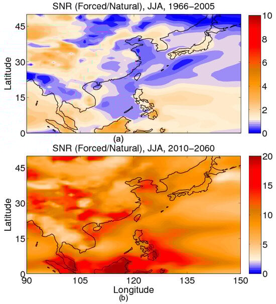 SNR over East Asia during the 1966–2005 period (a) and SNR over East Asia during the 2010–2060 period (b). SNR < 1 means internal variability overrides external forcing factors.