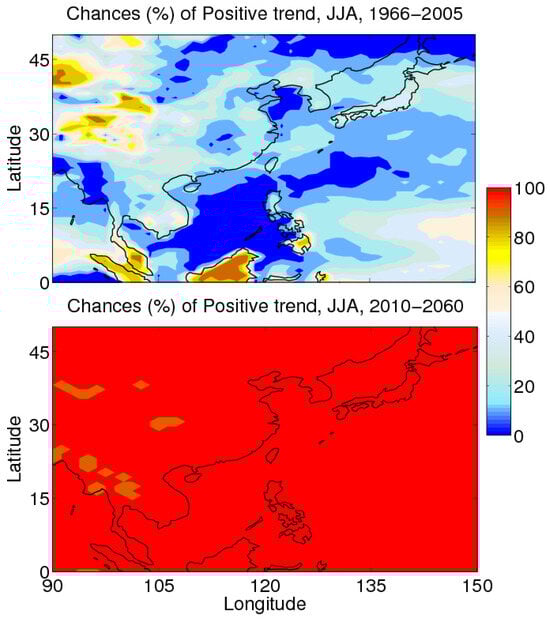 Percentage of occurrences or chances of a warming/positive trend over East Asia during the 1966–2005 period (top panel) and 2010–2060 period (bottom panel). Note that the lower the chances of warming, the higher are the chances of cooling.