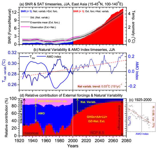 Here, we used the SNR as a metric to quantify the relative contribution of external forcings and internal variability to the SAT trend over East Asia. In the historical period, internal variability dominates over external forcings (SNR < 1), while external forcing overrides internal variability (SNR > 4) under the RCP8.5 scenario. In the historical period, the chances of East Asia cooling are higher than 80%, while the chances of warming touch ~100% under the RCP8.5 scenario. Therefore, the cooling trend due to internal variability partially counteracted the warming trend due to external forcing factors. The novel aspects of the current manuscript include the following. The cooling trend is more pronounced during the negative phase of the AMO, i.e., between the mid-1960s and 2000, which accounts for ~70–80% of the total SAT variability of East Asia. In the negative phase of the AMO, Rossby wave trains of North Atlantic origin may influence the cooling trend over East Asia. Secondly, after 2000, external forcing exhibits a slow but continuous increasing trend from ~55% in 2000 to 95% in 2075. Finally, we investigate the role of albedo feedback and increasing contribution of sensible heat fluxes in driving the warming trend under the RCP8.5 scenario. Here, we observe that the increasing trend in ensemble mean SAT is driven by the decreasing trend in albedo due to trapping of more downward heat fluxes in the future. It will increase the sensible heat fluxes over East Asia due to a greater temperature gradient between the ground and the atmosphere. This differential heating will increase the local temperatures and strongly override internal variability under the RCP8.5 scenario.
