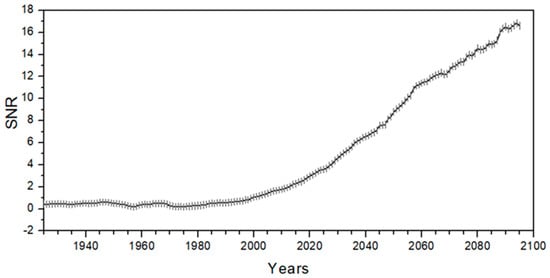 The Signal-to-Noise Ratio (SNR) is an assessment to quantify the relative contributions of external forcings and internal variability. The ratio of mean trend (absolute value) and standard deviation of the trends is the measure of their relative contributions to the projected trend.