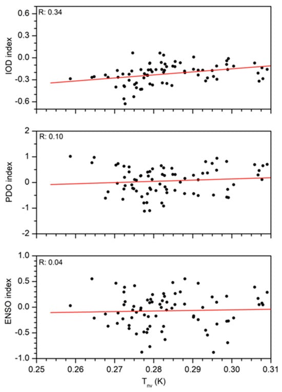 Correlation analysis between Tnatural variability and IOD index (top panel), between Tnatural variability and PDO index (middle panel) and between Tnatural variability and ENSO index (bottom panel).