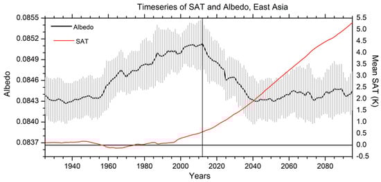 Timeseries of ensemble mean SAT (red line) and timeseries of ensemble mean albedo (black line) and its standard deviation (gray shading) over East Asia.