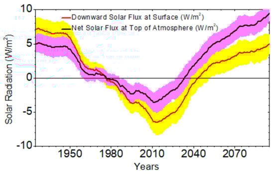 The decrease in albedo under the RCP8.5 scenario is the consequence of more solar energy being trapped by the surface and less radiation being reflected back to the atmosphere. In addition, a lower albedo often results in more solar energy being absorbed by the Earth system at the top of the atmosphere and thereby contributing to the warming by altering the energy balance dynamics. Therefore, it is imperative to understand this relationship for predicting the future changes in global temperatures over East Asia. In Figure 14, we plotted the timeseries of downward solar flux anomalies (red line) and net solar flux anomalies (black line) at the surface and at the top of the atmosphere, respectively. Initially, the fluxes had decreased until 2010, and thereafter, they increase until the end of the 21st century, which is consistent with the increasing and decreasing trends in SAT and albedo, respectively.