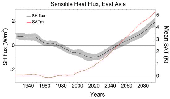Timeseries of SAT (red line) and timeseries of ensemble mean sensible heat flux (black line) and its standard deviation (gray shading) over East Asia.