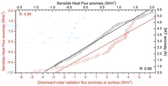 The empirical relationships between the downward solar fluxes at the surface and sensible heat flux and between sensible heat flux and SAT anomalies are established by computing the correlation coefficients between the variables in Figure 16. The correlation coefficient between the downward solar flux anomaly at the surface and sensible heat flux anomaly is 0.94 and between sensible heat flux and SAT anomaly is 0.99. They account for ~88% and ~98% of the variances that explain the multidecadal changes in ensemble mean SAT under the RCP8.5 scenario, respectively.