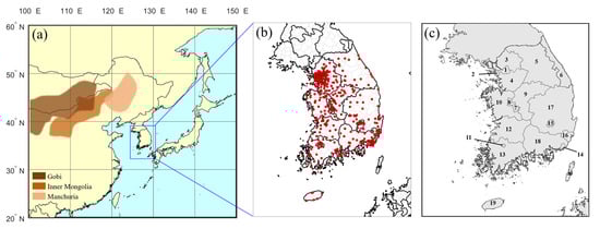 (a) Geographic domain (20–60° N, 100–150° E) used for meteorological analysis with ERA5/NCEP data. The blue boxes indicate the regions zoomed in for panels (b,c). Major desert source areas are approximate representative regions identified from previous literature and observational records, with dark brown representing the Gobi Desert, medium brown indicating Inner Mongolia, and light brown denoting Manchuria. (b) Distribution of PM10 monitoring stations across South Korea (531 stations as of February 2025, shown as red dots), forming the basis for regional concentration analysis. (c) Definition of 19 forecast regions used for spatial aggregation of PM10 concentrations and classification by cluster. The regions, numbered sequentially from 1 to 19, are listed as follows: Seoul (SEL), Incheon (INC), North Gyeonggi (NGG), South Gyeonggi (SGG), West Gangwon (WGW), East Gangwon (EGW), Daejeon (DJ), Sejong (SJ), Chungbuk (CB), Chungnam (CN), Gwangju (GJ), Jeonbuk (JB), Jeonnam (JN), Busan (BS), Daegu (DG), Ulsan (US), Gyeongbuk (GB), Gyeongnam (GN), and Jeju (JJ).