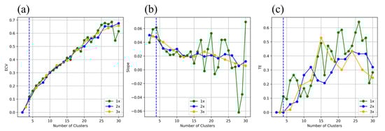 In this study, the SOM algorithm was applied using sea level pressure (SLP) and 850 hPa wind fields (u and v components) at the time of inflow into the Korean Peninsula for each Asian dust event as input variables. The gridded meteorological data over the East Asian domain (20–60° N, 100–150° E) were vectorized to form a high-dimensional input matrix. To determine the optimal number of clusters, various SOM grid configurations—from 1 × 1 to 3 × 10—were tested, and both the slope of the Explained Cluster Variance (ECV) and the Topographic Error (TE) were evaluated [,]. Based on the evaluation metrics, a four-cluster SOM configuration was selected as optimal. At this point, the slope of the ECV curve plateaued, indicating minimal information loss, and the TE was also lower than in other configurations, suggesting improved cluster separation. ECV is defined as the ratio of the within-cluster sum of squares (WSS) to the total sum of squares (TSS), which quantifies how well the cluster centroids represent the data []. Although ECV generally increases with the number of clusters, the marginal gain diminishes beyond a certain point, signaling a potential risk of overfitting [].