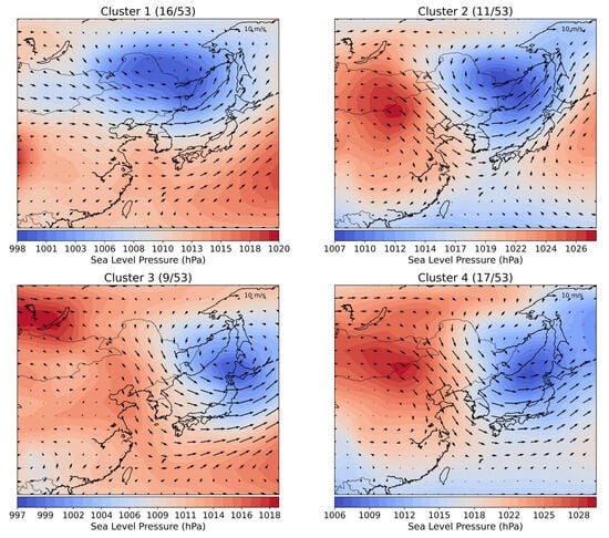 Examining the monthly frequency of Asian dust impacts, as shown in Figure 5, the frequency is generally higher in spring (March, April, and May), with March showing the highest occurrence. This seasonal pattern reflects favorable surface and atmospheric conditions in dust source regions such as the Gobi Desert and Inner Mongolia during spring. In particular, Cluster 1 events—typically associated with strong low-pressure systems and widespread dust transport—were concentrated in March, April, and May. While spring remains the peak season, the occurrence of events in autumn and winter also indicates that dust outbreaks can influence Korea throughout the year under appropriate synoptic conditions. These seasonal characteristics are consistent with previous studies [,].