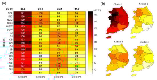 (a) Heatmap of mean PM10 concentrations (µg m−3) by region and cluster, derived from SOM classification. The numbers at the top of each column indicate the mean dust duration (DD, in hours) for each cluster. (b) Spatial map of mean PM10 concentrations across Korea, grouped by cluster. The visualization highlights spatial variability in dust impacts under different synoptic types.