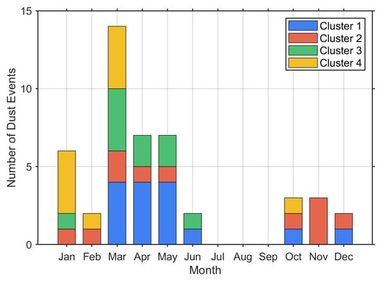 Monthly frequency of Asian dust events by SOM cluster during 2019–2024. Most events occurred in spring (March–May), with Cluster 1 showing the highest occurrence during March and April.