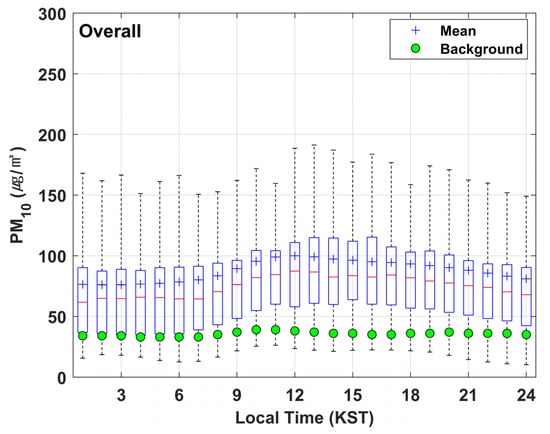 Diurnal variation of PM10 concentrations for all 53 dust events (1:00–24:00, local time). Box plots show the 25th to 75th percentile range, red lines indicate medians, and plus signs (+) denote mean values. The results highlight a general increase in PM10 during daytime hours (09:00–18:00). The x-axis shows local time (KST) from 1:00 to 24:00. In addition, green circles indicate the background mean PM10 concentrations (36 µg m−3) calculated from all monitoring data across the 19 forecast regions during January 2019–June 2024.