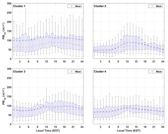 Diurnal PM10 concentration profiles by SOM cluster. Format as shown in Figure 6. Each box plot represents the hourly distribution (1:00–24:00) for dust events within a cluster. Differences in mean levels, variability, and peak timing reflect distinct temporal characteristics among the four synoptic types.