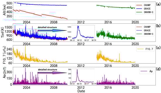 (a) Variations in orbital altitudes of the CHAMP (red), GRACE-A (blue), and SWARM-C (green) satellites during the period 2002–2020; (b) tinfs derived from satellite data; (c) variations in solar F10.7 index (red) and its 81-day moving average; (d) geomagnetic Ap index.
