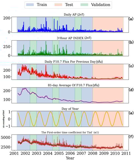 Schematic of the model’s data structure: (a) the blue line represents the daily average Ap index; (b) the green line represents the 3-Hour Ap index; (c) the red line represents the daily F10.7 flux for previous day; (d) the purple line represents the 81-day average of F10.7 flux; (e) the yellow line represents the sin encoding of DoY; (f) the dark red line represents the first-order time coefficient for tinf. The light-blue shaded region indicates the training set, with light-red and light-green corresponding to the testing and validation sets, respectively.