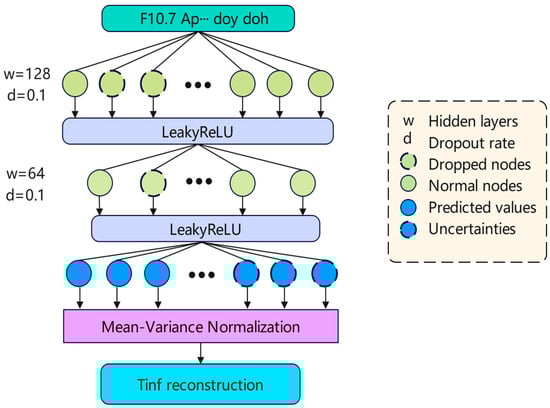 The neural architecture in Figure 3 processes multi-scale space weather parameters (Ap index, F10.7 flux, and 81-day moving average) through a 19-node input layer that encodes solar radiative forcing, geomagnetic disturbances, and diurnal and seasonal cycles. Subsequent hidden layers (128–64 nodes) implement leaky ReLU activation (α = 0.1) [26], maintaining gradient flow (∇f(x)|x < 0 = 0.1) while circumventing neuron death. The architecture’s innovation lies in its dual-output configuration: the first five nodes perform sPCA decomposition to extract principal component coefficients. At the same time, the remaining five generate heteroscedastic uncertainty estimates, producing probabilistically calibrated predictions in the form of y ± σ. This synthesis of physically interpretable feature engineering with probabilistic deep learning enables simultaneous deterministic prediction and rigorous uncertainty quantification for space environment modeling.