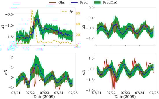 The neural network model demonstrates robust capability in predicting temporal coefficients of principal components along CHAMP satellite orbits, providing both coefficient estimates and their associated uncertainty ranges (±1σ, 68% confidence level). As illustrated in Figure 4, the model outputs show strong agreement with CHAMP-observed coefficients for the first four principal components during July 2009, effectively capturing multi-scale temporal variations driven by both geomagnetic activity (correlated with the Ap index) and diurnal cycles. A particularly noteworthy achievement is the model’s accurate reproduction of abrupt responses in the first, third, and fourth principal components during the geomagnetic storm at 03:00 UT on 22 July. For example, while the observed coefficient α1 peaks at ≈−0.75 approximately 7 h post-storm (10:00 UT), the model predicts a comparable peak value of −0.7 ± 0.3 at 11:00 UT, representing only a 1 h temporal offset. A comprehensive statistical analysis of 2009 predictions reveals that more than 90% of observations fall within the 68% confidence interval. This performance confirms the model’s ability to reconstruct tinf variations across spatiotemporal scales while reliably quantifying uncertainty in temporal coefficients—a critical capability for high-precision thermospheric density calculations with quantified uncertainty.