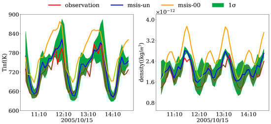 Comparison of CHAMP satellite tinf (left) and thermospheric atmospheric density observations (right) with predictions from the MSIS-UN and MSIS-00 models.