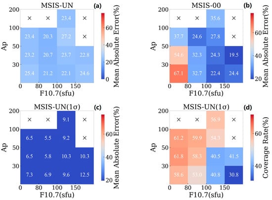 Computational errors of the MSIS-UN (a), MSIS-00 (b), and MSIS-UN (c) models, along with the accurate value coverage rates (1σ) of MSIS-UN (d) under different space environment conditions.