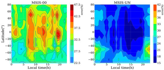 Comparative analysis establishes MSIS-UN’s overall superiority, with its maximum error (42%) substantially lower than MSIS-00’s peak discrepancy (47.5%). The only exception occurs in Southern Hemisphere mid-latitudes during nighttime conditions, where MSIS-00 maintains a marginal advantage. This comprehensive evaluation confirms MSIS-UN’s enhanced predictive capability across most spatial and temporal domains, while identifying specific regions that require further refinement of the model.