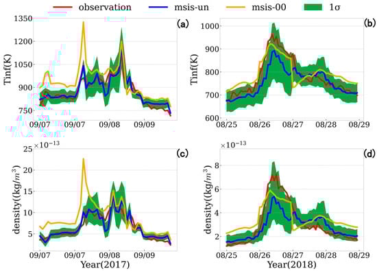 Comparison of (a,c) tinf and atmospheric density observed by SWARM-C (red lines) during the 2017 geomagnetic storms, and (b,d) corresponding 2018 storm events, with model predictions from MSIS-00 (yellow lines), MSIS-UN (blue lines), and MSIS-UN 1σ uncertainty bounds (green bands).