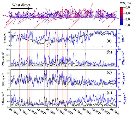 Temporal variations in meteorological conditions and concentrations of conventional pollutants. Wind direction (WD) and wind speed (WS) are shown at the top of the figure, followed by (a) Ambient temperature (T) and relative humidity (RH); (b) PM2.5 and PM10; (c) SO2 and NO2, (d) CO and O3. The red lines indicate the haze days.