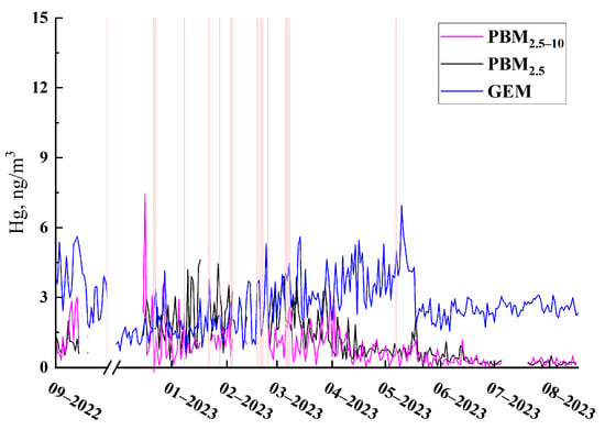 Temporal variations in Hg concentrations: , and GEM (gaseous Hg) (with red line indicating the haze days).