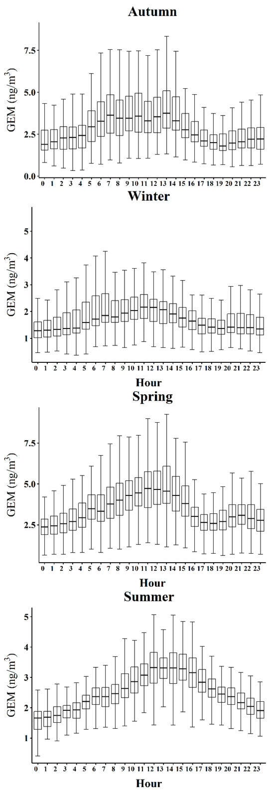 Diurnal variation in GEM (gaseous Hg) levels across seasons: the middle line represents the median, the box edges represent the 25th and 75th percentiles, and the upper and lower whiskers represent the maximum value within Q3 + 1.5 × IQR and the minimum value within Q1 − 1.5 × IQR, respectively. (IQR: interquartile range).