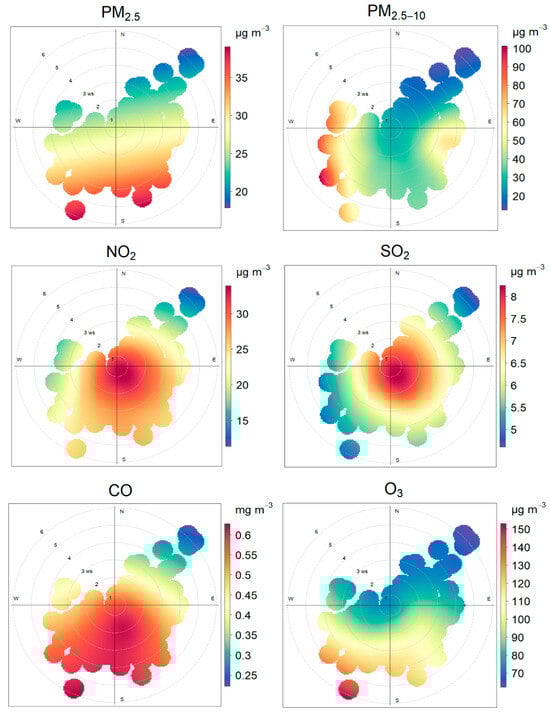 The polar plot analysis revealed that PM2.5, NOx;, and CO exhibited similarly elevated concentrations under southerly wind conditions, likely attributable to emissions from vehicles and ships along the eastern to western coast. In addition, when the prevailing winds were from the west, the sampling site was affected by coarse particles, leading to higher PM2.5–10 concentrations. These coarse particles were probably associated with nearby construction activities, exposed soil surfaces, farmland, and road dust.