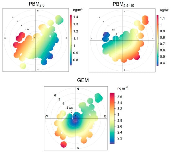 Previous studies have demonstrated that atmospheric mercury concentrations are influenced by multiple factors, including combustion emissions, industrial activities, atmospheric chemical reactions, physical transport processes, and meteorological conditions [30,60,61,62]. However, the abnormally high concentrations of PBM observed in this study exceed the typical levels reported in similar environments and cannot be fully explained by these conventional factors. Hence, polar plot analysis was used to identify the potential sources, and the results are presented in Figure 5. While SO2 and NO2 appear to have predominantly local sources, the Hg species are more associated with longer-range emissions, although with very different source regions.