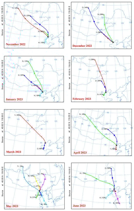 Illustrates the monthly composite of air mass back trajectories from September 2022 to August 2023, with each trajectory simulated for a total run time of 48 h. These trajectories were calculated at an elevation of 50 m above ground level utilizing the HYSPLIT (Hybrid Single-Particle Lagrangian Integrated Trajectory) model.