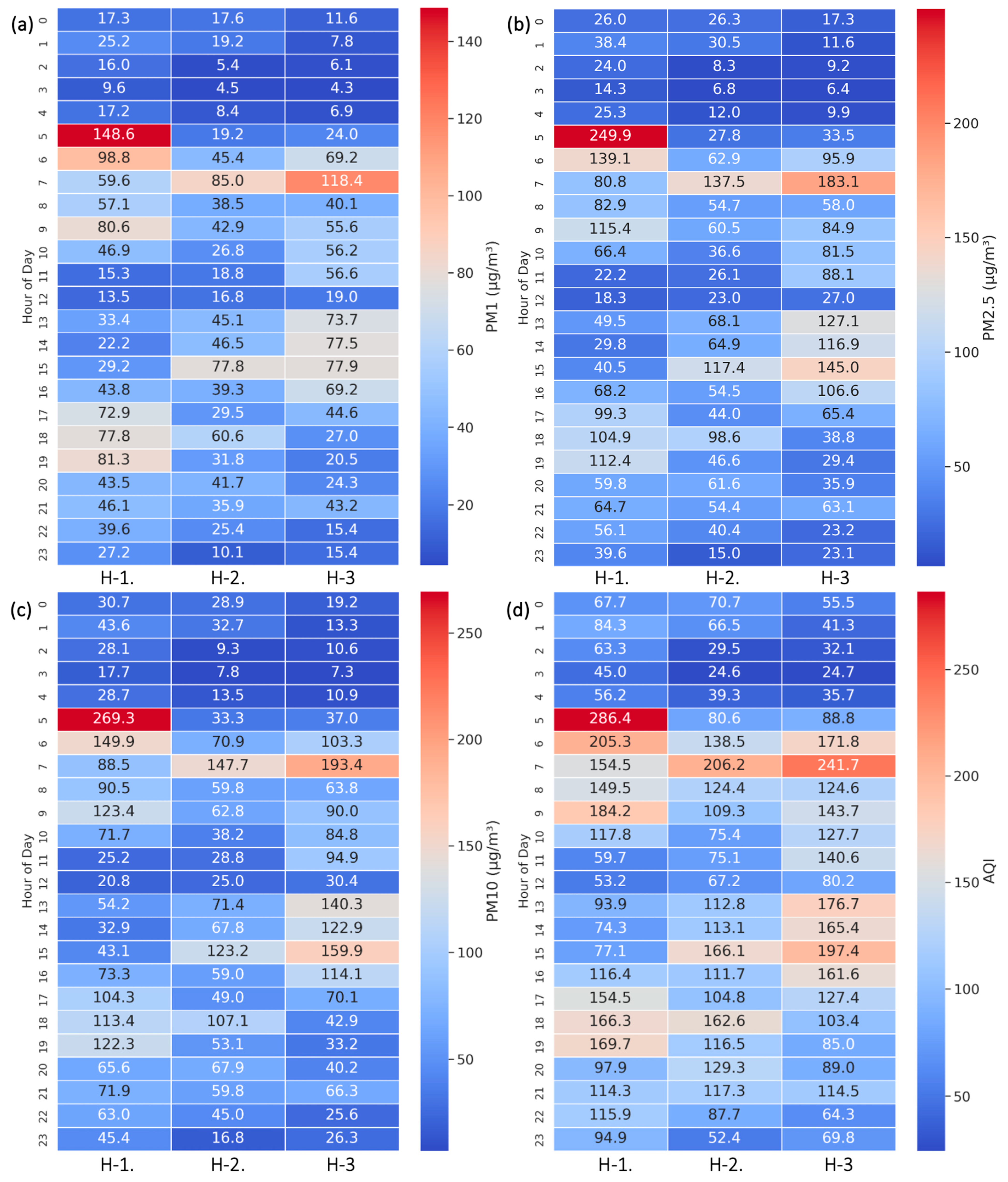 Time | PM1 (µg/m3) | PM2.5 (µg/m3) | PM10 (µg/m3) | AQI-PM2.5 (–) | ||||||||