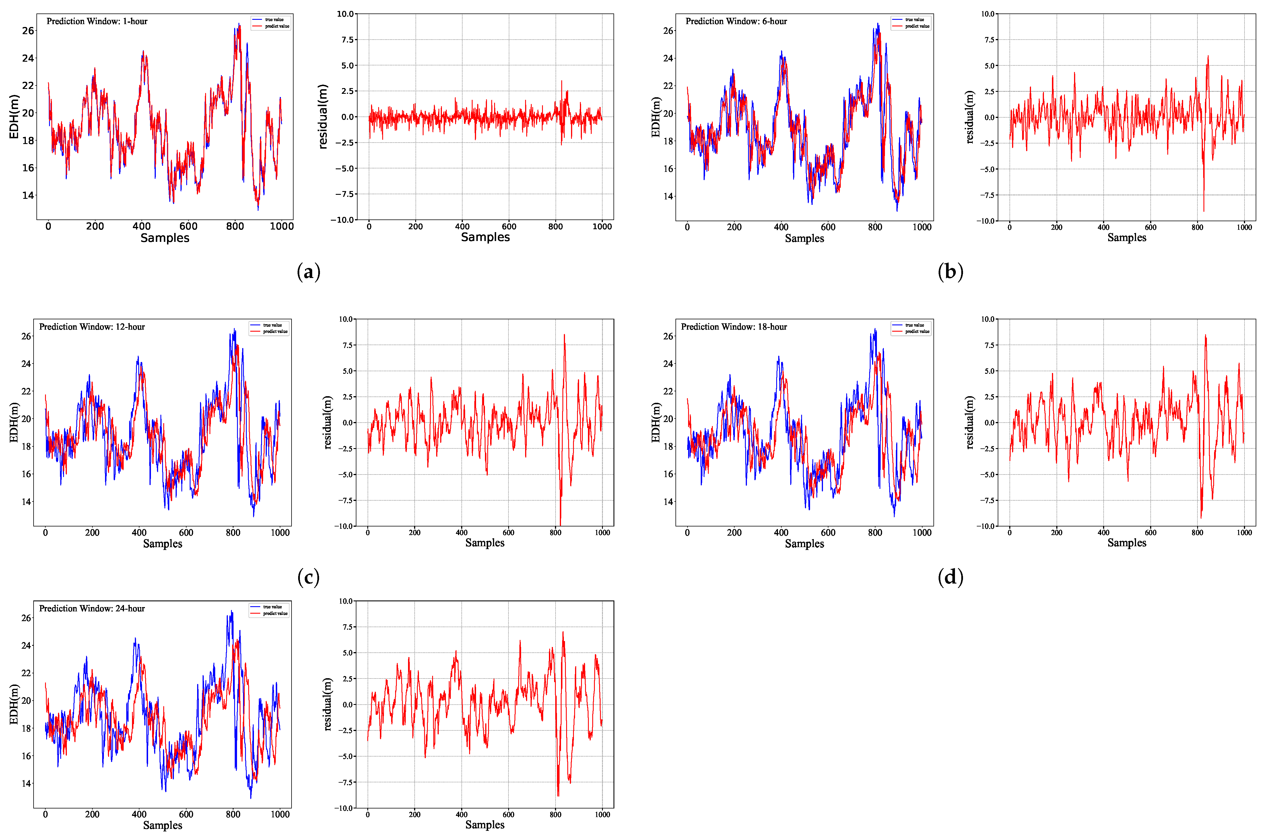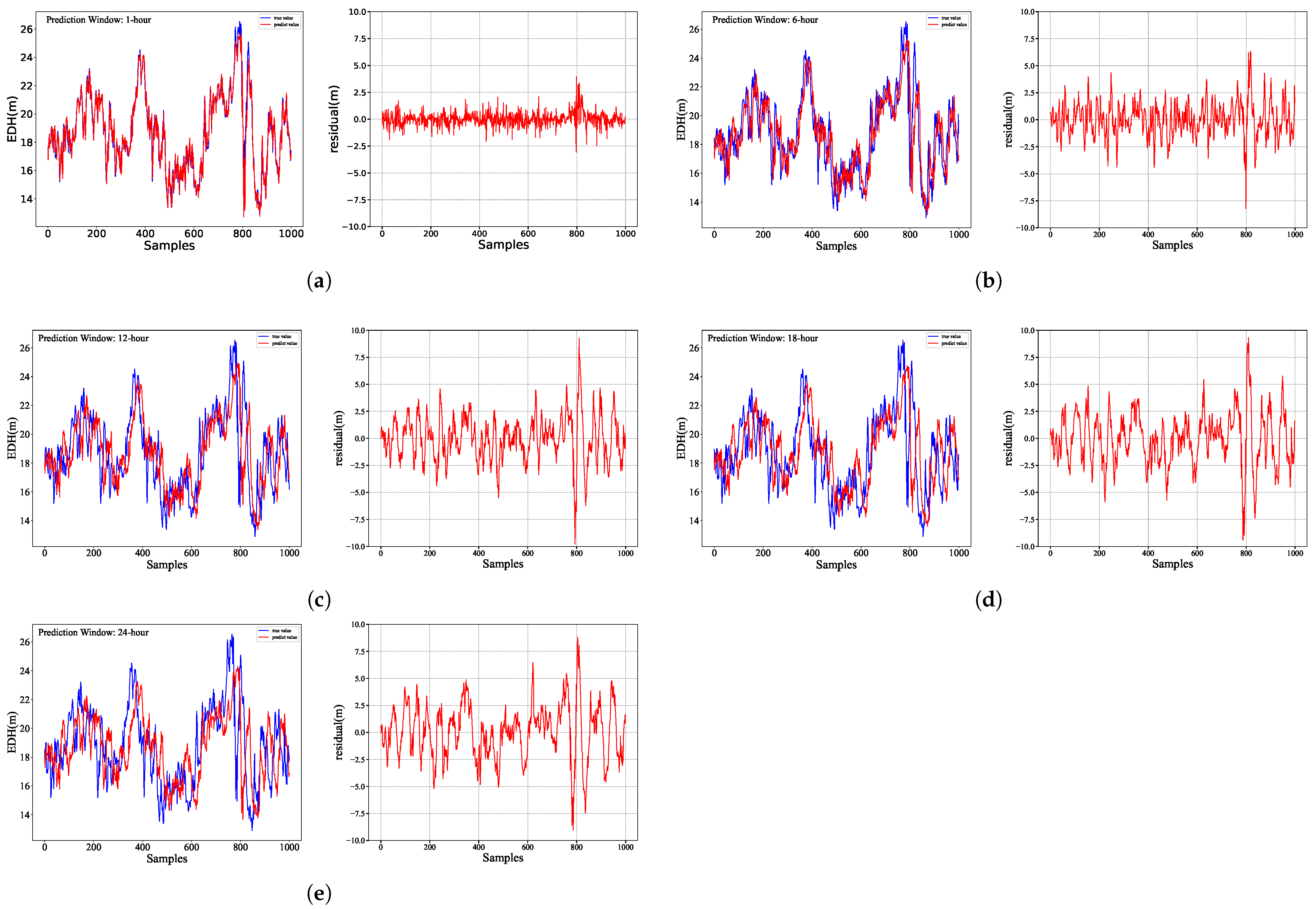(1) The BO–LSTM model developed in this study demonstrates the capability to effectively predict EDH values up to 24 h in advance, although its predictive accuracy decreases with increasing forecast horizon. For the 1 h forecast, the model achieves a root mean square error (RMSE) of 0.592 m, a mean absolute error (MAE) of 0.407 m, and a coefficient of determination (R2) of 0.961, indicating strong agreement with the observations. In contrast, for the 24 h forecast, the RMSE and MAE increase to 2.393 m and 1.808 m, respectively, while the R2 drops substantially to 0.362, reflecting a notable decline in predictive skill over longer time scales.