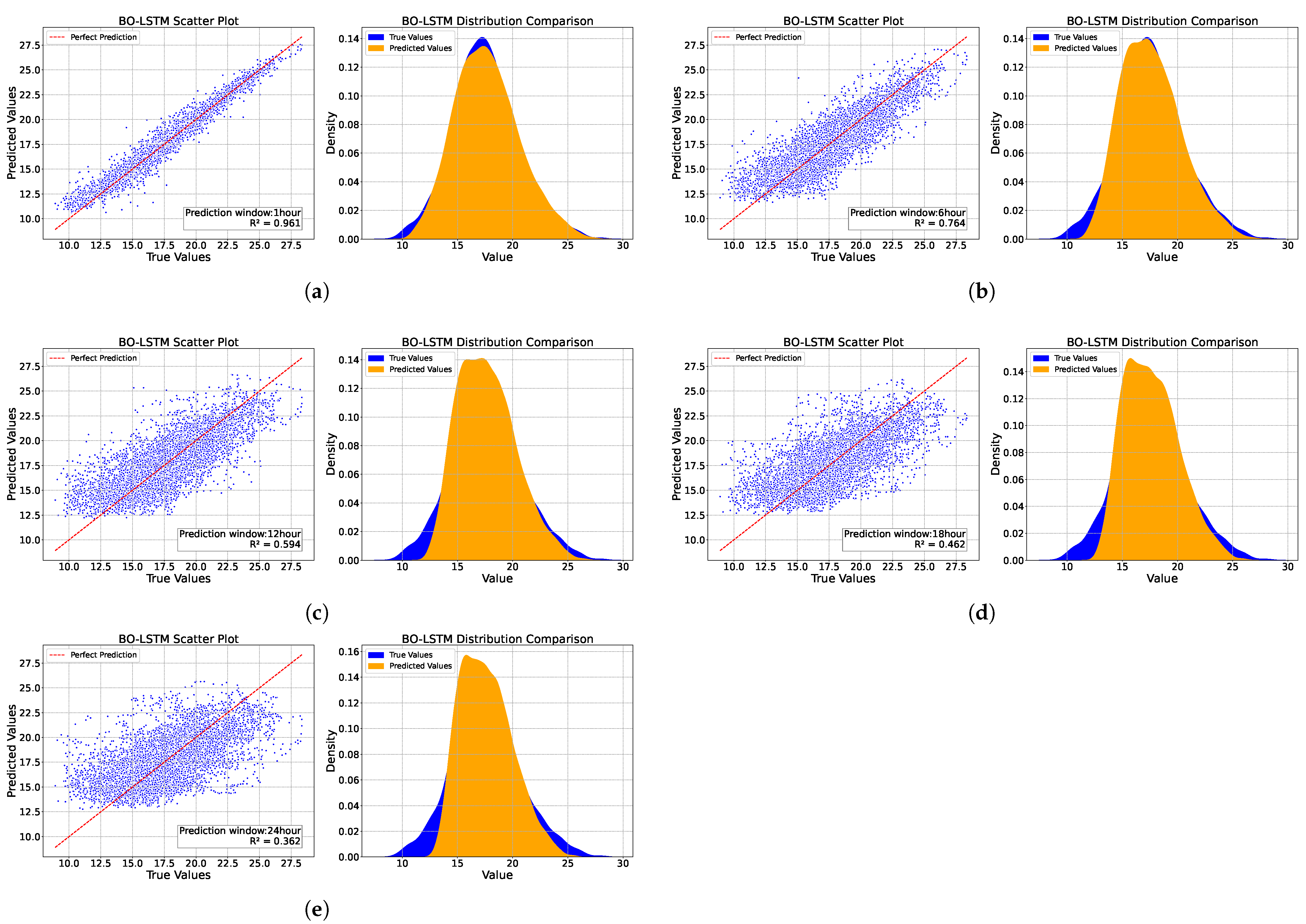 (2) To validate the effectiveness of Bayesian optimization (BO), we compared the BO–LSTM model with the baseline LSTM model. The results demonstrate comparable prediction accuracy between BO–LSTM and LSTM for 1–15 h forecasts, with BO–LSTM showing marginally better performance. As the prediction horizon increases, the prediction accuracy of the BO–LSTM model gradually surpasses that of the LSTM model, indicating that the Bayesian-based automatic hyperparameter optimization approach can enhance the model’s predictive performance.