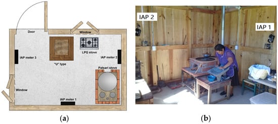 Simulated kitchen. (a) Diagram of the location of the IAP meters and cooking devices; (b) image of the location of the IAP meters and the cook during a CCC.