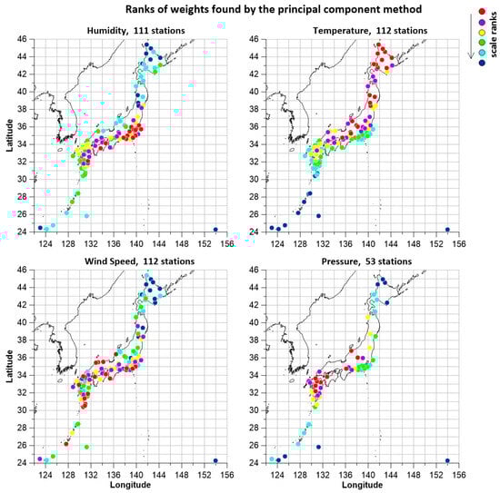 For each meteorological parameter, the time series of the weighted average was calculated using the principal component method [36], in which the squares of the components of the eigenvector corresponding to the maximum eigenvalue of the correlation matrix of the multidimensional time series were taken as weights. By construction, the sum of the weights was equal to one. A station’s weight reflects the contribution of measurements made at that station to the overall average. In Figure 1, the positions of the meteorological stations for which the time series for humidity, temperature, wind speed, and atmospheric pressure were used are shown with colored dots. The color of the dot reflects the rank of the station weight, which contributes to the calculation of the weighted average. A total of 6 ranks were used; to calculate them, the range of change in weights for each parameter was divided into 6 intervals containing the same number of elements. On the maps shown in Figure 1, the remote station MINAMI TORISHIMA (Lat = 24.289697, Lon = 153.979119) stands out; its weight for all parameters belonged to the lowest rank.