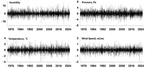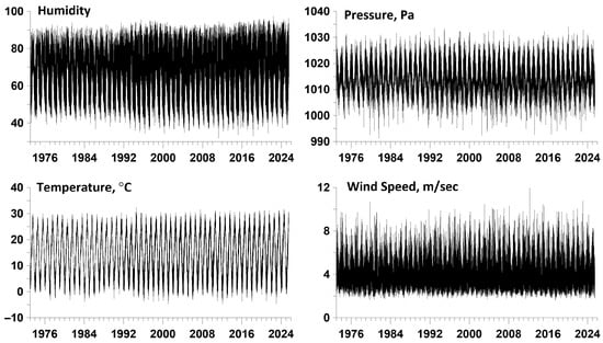 The temperature, humidity, barometric pressure, and wind speed time series used in this study are freely available from https://www.ncei.noaa.gov/data/global-hourly/archive/csv/ (accessed on 20 July 2025). The numbers of meteorological stations in Japan with available temperature, humidity, barometric pressure, and wind speed data are 386, 379, 251, and 387, respectively. The earliest start of the time series dates back to 1946, but there are significant gaps in the data before 1973. Since 1973, the number of stations with available data has increased sharply. Therefore, time series starting from 1973 with a longest gap duration not exceeding 0.5 years were further selected. The gaps were filled based on the behavior of the data to the left and right of the gap time interval in time segments of length equal to the gap length. The time series were then reduced to a uniform time step of 3 h by averaging the data within successive 3 h time intervals. As a result, time series of humidity from 111 stations, temperature from 112 stations, wind speed from 112 stations, and atmospheric pressure from 53 stations were obtained. The length of the obtained synchronous time series was 153,452 readings at intervals of 3 h from the beginning of 1973 to 7 July 2025 (52.5 years).