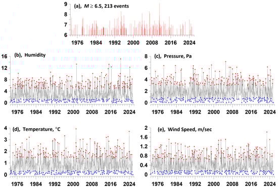 Figure 4a shows the time sequence of seismic events with a magnitude of at least 6.5 in the rectangular vicinity of the Japanese islands, shown in Figure 1, for the time interval from the beginning of 1973 to 7 July 2025. Figure 4a–d show the envelopes for the seventh level of wavelet decomposition of the weighted average time series of humidity, pressure, temperature, and wind speed and indicate the positions of the 213 most expressive local extrema of the envelopes: red dots mark local maxima, and blue dots mark local minima.