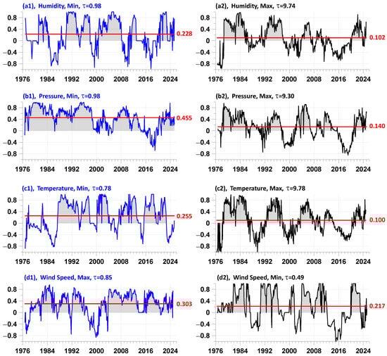 The left-hand column of graphs (blue lines; (a1,b1,c1,d1)) presents the lead measures (for the variants with the highest average values in Table 1) at the time points of the smallest local minima (a1,b1,c1) for the amplitudes of the humidity, pressure, and temperature envelopes and the largest local maxima (d1) for wind speed relative to the occurrence times of earthquakes with magnitudes not lower than 6.5. The right-hand column of graphs (black lines; (a2,b2,c2,d2)) presents the lead measures at the time points of the largest local maxima (a2,b2,c2) for the amplitudes of the humidity, pressure, and temperature envelopes and the smallest local minima (d2) for wind speed relative to the occurrence times of earthquakes with magnitudes not lower than 6.5. All graphs show the values of optimal relaxation times ; horizontal red lines and red numbers show the average values of the lead measures. The colors of the graph lines correspond to the colors of the words in Table 1.
