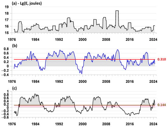 Graph (a) presents the logarithm of the released seismic energy (in joules) in a 365-day window with a shift of 36 days. Graph (b), blue line, presents the average measure of lead by the time points of the most pronounced local extremes of envelope amplitudes for four meteorological parameters relative to the time points of earthquakes with magnitudes not lower than 6.5 for the variants with the highest average values in Table 1. Graph (c), black line, presents the average measure of lead by the time points of the most pronounced local extremes of envelope amplitudes for four meteorological parameters relative to the time points of earthquakes with magnitudes not lower than 6.5 for the variants with the lowest average values in Table 1. The horizontal red lines and red numbers show the average values of the average measures of lead. The colors of lines in graphs (b,c) correspond to the colors of words in Table 1.
