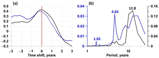 In (a), the blue line plots the Spearman correlation function between the seismic energy release in a 365-day window with a 36-day shift (Figure 6a) and the average lead curve of the most pronounced local extremes for the variants with the highest average values in Table 1 of envelope amplitudes for the four meteorological parameters relative to the times of earthquakes with magnitudes not lower than 6.5 (Figure 6b). The black line in (a) plots the Spearman correlation function between the seismic energy release and the average lead time of the most pronounced local extremes for the variants with the lowest average values in Table 1 of envelope amplitudes for the four meteorological parameters relative to the times of earthquakes with magnitudes not lower than 6.5 (Figure 6c). (b) shows the estimated power spectra of curves of changes in the average lead measures in Figure 6a,b (blue and black lines, respectively); the numbers indicate the periods of the spectral peaks. The colors of lines in graphs (a,b) correspond to the colors of lines in Figure 6b,c.