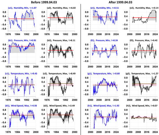 Graphs of the lead measures for meteorological parameters for data before and after 3 April 1999. All graphs show the values of optimal relaxation times ; horizontal red lines show the average values of the lead measures. The colors of graph lines correspond to the colors of words in Table 2 and Table 3.